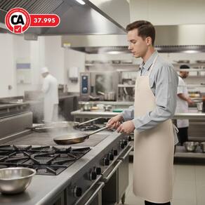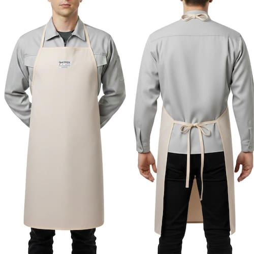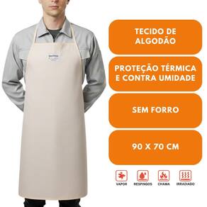 Avental de segurança confeccionado em tecido de algodão tratado para proteção do tronco do usuário contra agentes térmicos.