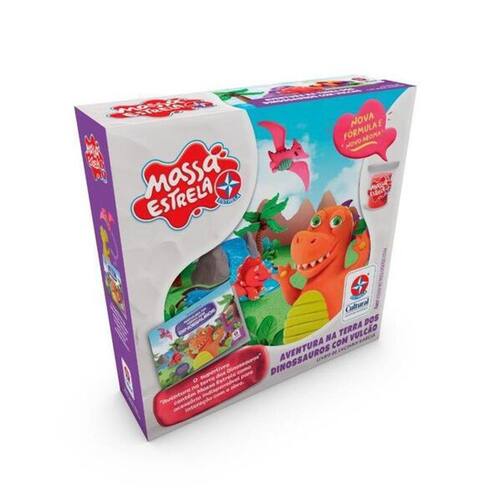 Contém: 1 livro interativo de 24 páginas, 1 forma de Pterodáctilo, 1 forma de Dinoceronte, 1 forma de Dino Rex, 1 forma de Dino, 1 forma de tronco de árvore, 1 forma de folha que coqueiro, 1 faca, 1 rolinho e 4 potes de 50g de Massa Estrela.
