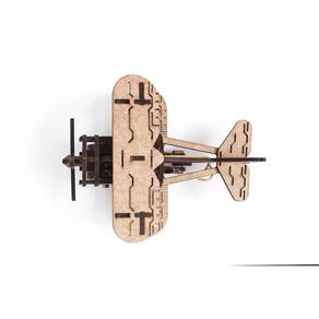 Um belo quebra cabeças 3-d com partes mecânicas funcionais, o modelo avião biplano é fabricada através de corte a laser em mdf 3mm. Possui movimentação de rodas e hélice, com tracionamento e propulsão por motores elásticos, dando movimento cinético ao produto.