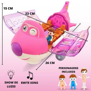 = = = = = = = = = = = = = = = = = = = = = = = descrição = = = = = = = = = = = = = = = = = = = = = = = Avião musical gira 360 bate e volta com passageiros interativos. Deixe seus filhos se transformarem em pilotos e experimente se divertir com eles O avião possui personagens interativos, que permitem dar asas a imaginação, estimulando cenários e situações, juntamente com suas luzes coloridas e sons ,mantém as crianças entretidas com muita animação. A parte superior central do avião se abre, deixando amostra luzes e passageiros.