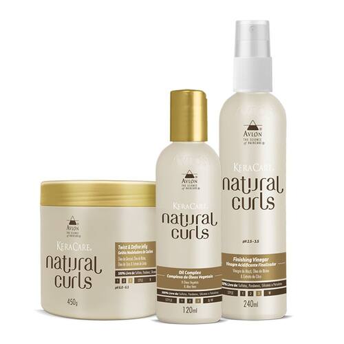Contém: • Natural Curls Oil Complex 120ml: Complexo de óleos que nutre profundamente os fios cacheados e crespos ressecados, opacos e sem vida. • Natural Curls Twist & Define Jelly 450g: Geléia ativadora de cachos que define os fios naturalmente cacheados e crespos. • Vinagre Finalizador de Cachos Naturais 240ml: Acidificante capilar indicado para finalizar químicas, tratamentos e estilizações. Sua ação, além de potencializar os tratamentos, reflete maior brilho e controle das cargas elétricas da superfície da fibra capilar.