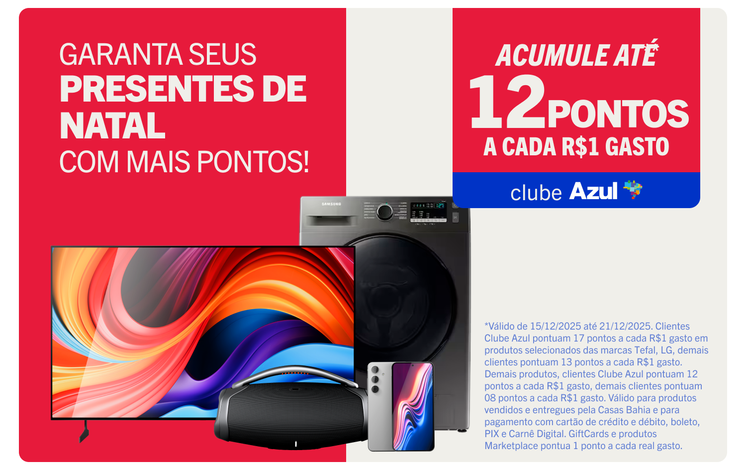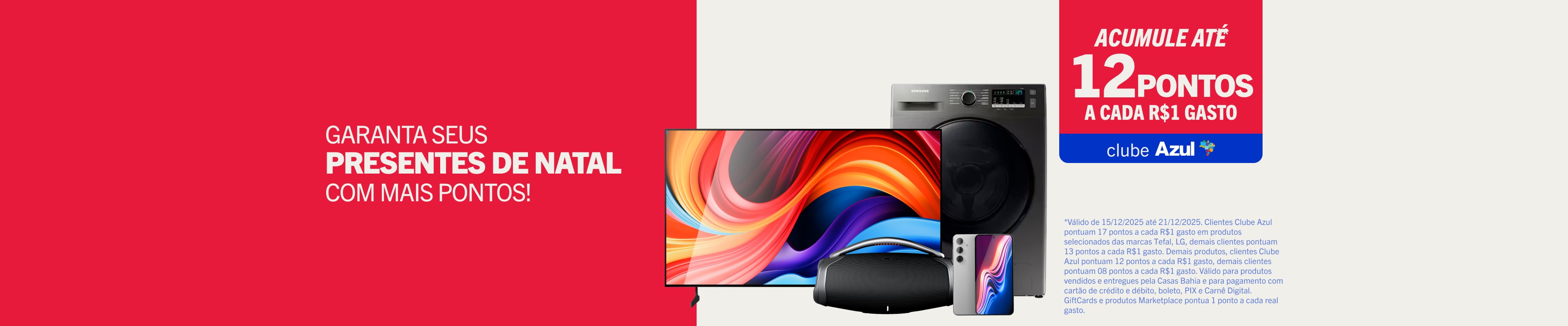 Os Pontos/Milhas adquiridas nas compras pelo Hotsite serão creditados na conta do Participante em até 15 dias corridos após a entrega do produto. A Casas Bahia e a Azul não se responsabilizam pela informação incorreta, pelo Participante, do número de CPF.