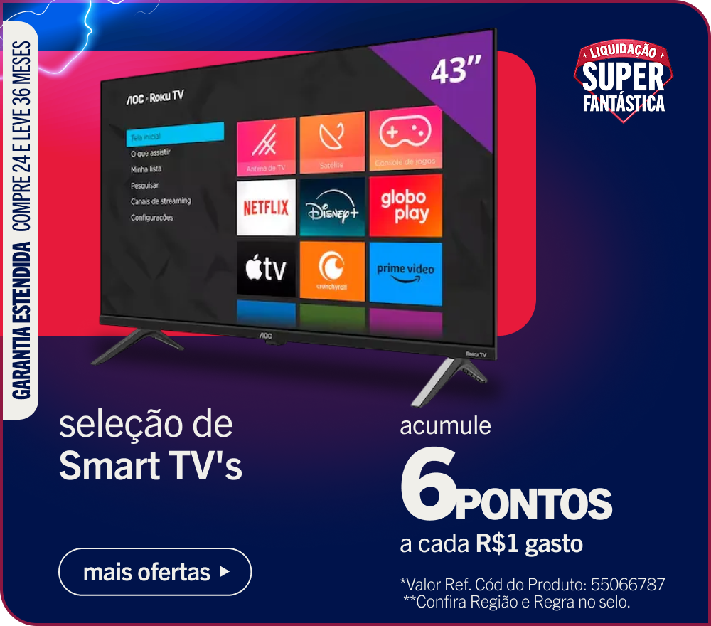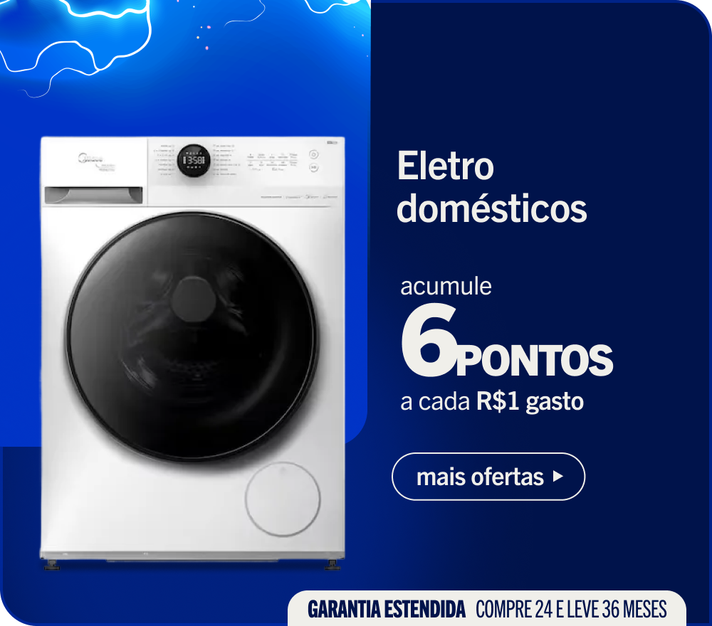 Válido até 05/01 Serão creditados 6 pontos por real gasto em Telas, Eletrodomésticos e Móveis, e 5 pontos por real gasto nos demais itens do site, sendo produtos vendidos e entregues por www.casasbahia.com.br. Gift Card e produtos Marketplace serão creditados 1 ponto por real gasto.