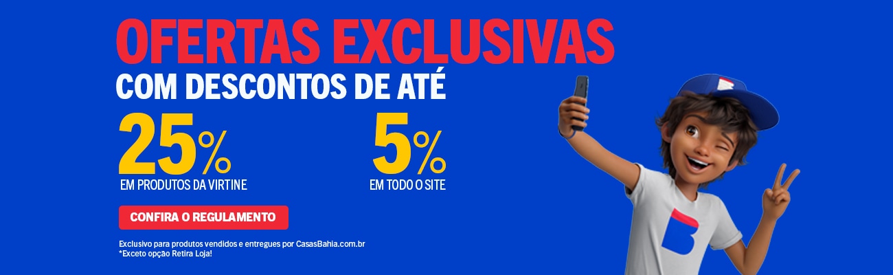 Os descontos já estão aplicados nos preços dos produtos no site e são válidos somente para os produtos comercializados por Casas Bahia, itens de Marketplace não entram na promoção. A política de frete, parcelamento, prazo de entrega e meios de pagamento seguem as regras vigentes do site www.casasbahia.com.br.