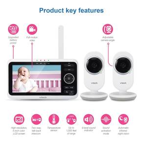 Tela de alta resolução de 5 com 2 câmeras Veja claramente cada pequeno movimento do seu bebê enquanto lava a louça ou da cama. A tela LCD de alta resolução mostra imagens em cores durante o dia e imagens infravermelhas em escala de cinza à noite, brilhantes e claras sem E se você precisar ver de perto a câmera aumenta o zoom 2x. Com 2 câmeras, você pode escolher como deseja ficar de olho em sua família visualização única, visualização em tela dividida ou modo de patrulha. Melhor duração e alcance da bateria da categoria Com até 12 horas de transmissão de vídeo, até 21 horas de monitoramento somente de áudio, com uma única carga, este sistema permite monitorar seu bebê durante a noite com facilidade. O longo alcance de operação confiável do sistema de até 304 m, permite que você continue o seu dia e permaneça conectado com seu bebê de outra sala ou mesmo do quintal. Privacidade garantida. Sem Wi Fi ou emparelhamento de aplicativos Com a confiança das famílias dos EUA há mais de 3 décadas, cada monitor VTech é transmitido por meio de um canal interno de 2,4 GHz com tecnologia FHSS, para que você possa ter certeza de que é o único que pode ouvir e ver seu bebê