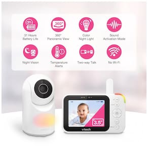 Mantenha-se de olho no seu pequeno com a ampla tela LCD de 8 cm do VTech VM4263 Monitor de Bebê em Vídeo Digital com Giro e Inclinação e Luz Noturna. Esse monitor de vídeo permite que você gire e incline para ter uma visão completa de todos os ângulos no berçário usando a unidade dos pais de longo alcance. Acalme seu bebê usando a luz noturna multicolorida sensível ao toque que se ajusta à iluminação do berçário, além de canções de ninar e sons suaves que tocam diretamente na unidade do bebê. Além disso, você pode garantir que seu bebê esteja confortável monitorando a temperatura do berçário, exibida na tela LCD de 8 cm. E, o mais importante, você pode verificar durante a soneca ou após escurecer, graças à visão noturna automática por infravermelho. TELA LCD COLORIDA DE ALTA RESOLUÇÃO DE 8 CM. Veja claramente cada movimento do seu bebê diretamente da unidade dos pais. Ao verificar seu bebê, você sentirá como se nunca tivesse saído do berçário. GIRO, INCLINAÇÃO E ZOOM DA CÂMERA A PARTIR DA UNIDADE DOS PAIS Veja seu pequeno se movimentando. A câmera gira até 270 graus de um lado para o outro e inclina até 25 graus para cima e para baixo. Precisa de mais detalhes? A câmera ainda dá zoom até 2 vezes. LUZ NOTURNA SENSÍVEL AO TOQUE As 7 luzes noturnas coloridas ajustam automaticamente o brilho para a iluminação ideal. Toque no ícone da luz para controlar a luz noturna. SONS RELAXANTES E CANÇÕES DE NINAR Duas melodias calmantes e dois sons suaves, incluindo um riacho e ruído branco, ajudam seu bebê a entrar em um sono tranquilo. CONVERSA BIDIRECIONAL ÀS VEZES, tudo que seu bebê precisa é ouvir o som da sua voz. Conforte seu bebê de qualquer cômodo com o intercomunicador integrado na unidade portátil dos pais. SENSOR DE TEMPERATURA Mantenha seu pequeno confortável. O indicador de temperatura na unidade dos pais avisa quando é hora de ajustar o termostato. VISÃO NOTURNA AUTOMÁTICA POR INFRAVERMELHO A câmera detecta automaticamente a luz fraca, permitindo que você veja os bocejos e alongamentos do seu bebê mesmo em quartos escuros.