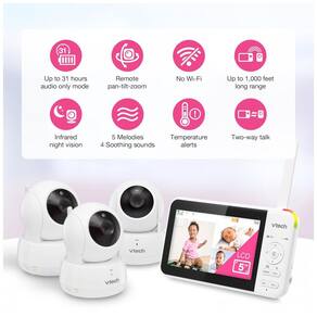 Mantenha-se conectado ao seu pequeno com o Monitor de Vídeo Digital VTech VM9243 com Pan Tilt e tela LCD de 12 cm. Esse monitor de vídeo permite que você faça panorâmicas e inclinações para ter uma visão completa de todos os ângulos no quarto do bebê, usando a unidade dos pais de longo alcance. Acalme seu bebê com canções de ninar e sons suaves reproduzidos diretamente da unidade do bebê. Além disso, você pode garantir que seu bebê esteja confortável monitorando a temperatura do quarto, exibida na tela LCD. Com a melhor bateria da indústria, você pode monitorar seu bebê facilmente por toda a noite, com até 17 horas de transmissão de vídeo com uma única carga. Com modo de ÁUDIO até 31 horas ou VÍDEO até 17 horas, monitore seu bebê com facilidade por toda a noite ou dia. VISÃO PANORÂMICA REMOTA PARA UMA VISÃO PANORÂMICA DE 360 GRAUS - Visualize 360 graus com 132 graus de visão vertical para cima e para baixo. Aproxime até 2x para ficar mais perto do bebê. TELA LCD DE 12 CM - Verifique seu bebê com a unidade dos pais LCD de 5 polegadas de qualquer cômodo da casa. CÂMERA DE VISÃO NOTURNA COM MODO APENAS ÁUDIO - Veja claramente seu bebê com a visão noturna automática por infravermelho. Quando detecta algum som acima da sua configuração de volume de áudio, a tela se acende automaticamente. INSTALAÇÃO FÁCIL E TRANSMISSÃO SEGURA - Sem necessidade de pareamento ou conexões Wi-Fi. Sem aplicativos necessários. Com alcance de até 304 metros, você pode realizar suas atividades diárias e se manter conectado ao seu bebê, mesmo do quintal. SONS RELAXANTES E SENSOR DE TEMPERATURA - Crie e monitore um ambiente confortável e agradável para o bebê, com a temperatura ideal e sons naturais/canções de ninar para acalmar os sentidos. COMUNICAÇÃO BIDIRECIONAL - Às vezes, tudo o que seu bebê precisa é ouvir o som da sua voz. Conforte seu bebê de qualquer cômodo com o intercomunicador embutido na unidade dos pais portátil.