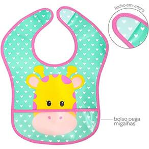 Além disso, o babador possui uma pega migalhas na parte inferior, que serve como um "bolso" para recolher as migalhas e resíduos de comida que caem durante a alimentação. Isso ajuda a manter o bebê limpo e evita que as migalhas se espalhem pela roupa e pelo ambiente.