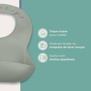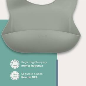 Características Principais: Pega Migalhas Integradas : O design com bolso coletor evita que os alimentos caiam na roupa e no colo do bebê, mantendo-o mais limpo durante as refeições. Segurança : Fabricado em silicone livre de BPA, o babador é seguro caso o bebê o coloque na boca. Conforto e Ajuste : Material de toque macio e 4 ajustes de tamanho para acompanhar o crescimento da criança. Praticidade na Limpeza : Pode ser lavado na máquina de lavar louça, facilitando a rotina dos pais. Além disso, é resistente a micro-ondas e ao congelador, o que torna o uso ainda mais versátil.