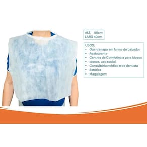 01 um Pacote de Babador Descartável Tnt Com Tiras Branco 30g Pct 100 unids Resistente, não libera fiapos. É antialérgico, atóxico e não inflamável. Cores: Branco Tamanho único - 50cm x 40cm Para uso de adultos ou adolescentes em restaurante e para ajudar idosos se proteger nos momentos de refeições, diariamente ou em atividades sociais. O conforto é o objetivo do uso de babadores descartáveis, aos clientes de restaurantes e também as pessoas em vários tipos de atividades do dia a dia, idosas e não idosas, assim como nos ambientes de estética e consultórios médicos. Excelente para consultório médico e de dentista, estética, maquiagem, salão de beleza, Restaurantes e para uso familiar, para idosos, centro de convivência e crianças. Podem ser também em escolas. Marca: Não Informado
