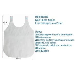 Babador Descartável Tnt Com tecido adesivo Branco 30g 50x40 Para Tatuagem e Maquiagem de Rosto Pct 100unids Resistente, não libera fiapos. É antialérgico, atóxico e não inflamável. Cores: Branco Tamanho único - 50cm x 40cm Para uso de adultos ou adolescentes para proteger a cliente na tatuagem e maquiagem de Rosto, em restaurante e para ajudar idosos se proteger nos momentos de refeições, diariamente ou em atividades sociais. O conforto é o objetivo do uso de babadores descartáveis, aos clientes de ambientes de tatuagem e maquiagem, restaurantes e também as pessoas em vários tipos de atividades do dia a dia, idosas e não idosas, assim como nos ambientes de estética e consultórios médicos. Excelente para consultório médico e de dentista, estética, maquiagem, tatuagem, , depilação de rosto, salão de beleza, Restaurantes e para uso familiar, para idosos e crianças, em asilos, dentre outros. Podem ser também em escolas. Marca: Não Informado