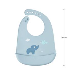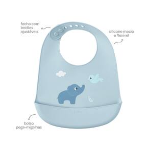 Principais características:babador em silicone com pega migalhas frontaldesign Cloudy Elefante na cor azulsilicone macio seguro e confortávelfácil de limpar resistência a manchasajuste ergonômico confortável para o bebê