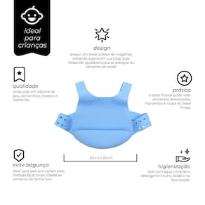 Com um design inovador, este babador é confeccionado em silicone 100% resistente e hipoalergênico, sendo totalmente livre de BPA (BPA-Free), o que garante total segurança para a pele sensível do seu bebê.