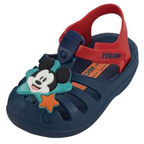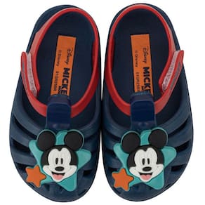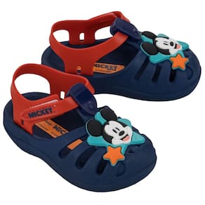 O destaque da peça é o aplique exclusivo do Mickey na parte superior, com acabamento em alto-relevo que dá um toque lúdico e divertido ao visual. A combinação de cores vibrantes valoriza ainda mais a estética do personagem, enquanto o efeito bicolor traz um ar moderno e cheio de personalidade à sandália. As tiras são estilizadas e contam com fechamento em tira autocolante, o que garante um ajuste fácil, prático e seguro para os pequenos explorarem o mundo com liberdade e confiança.