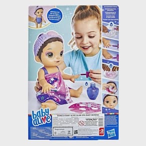 Baby Alive - Boneca Glam Spa - Morena F3565 - HasbroBoneca baby alive glam spa morena é o modelo perfeito para meninas acima de 3 anos que queiram deixar a brincadeira do faz de conta ainda mais divertida.No dia do spa a sua baby alive vai se sentir glamurosa com água gelada, encha o frasco de esmalte falso e passe na unha da boneca baby alive glam spa baby e veja uma revelação de cores. Em seguida, encha uma tigela com água gelada e molhe a máscara da boneca - aplique no rosto e remova para uma linda revelação de maquiagem dos olhos esta adorável boneca mede 30cm de altura e vem vestindo um maiô roxo moldado e uma faixa de cabeça com tema anexado. Ela também apresenta acessórios de boneca de spa com tema de sereia, incluindo uma toalha, máscara de boneca e frasco de esmalte de unhas. Além disso, ela ainda vem com um pente para as crianças escovarem e estilizarem seu rabo de cavalo com listras de cor roxaCertificado: INMETRO ce-bri/innac-01637-11a nbr nm 300/2004 ocp 0046