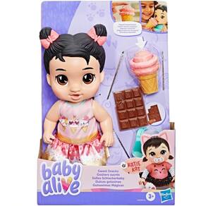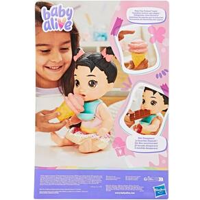 É hora do lanche com a boneca Baby Alive Katie Kat! Com 28 cm, braços e pernas articulados e cabelo preto moldado, ela vem pronta para muita diversão comidinha. Inclui babador removível, uma barra de chocolate e um sorvete mágicos que simulam mordidas quando pressionados contra a boca da boneca, diversão sem bagunça e com mordidas que desaparecem e reaparecem quantas vezes quiser! A roupa com estampa de sorvete é removível, e o corpo rígido permite que ela fique sentada ou em pé. Ideal para crianças a partir de 3 anos, essa boneca incentiva o faz de conta, desenvolve empatia e estimula a imaginação. Uma excelente opção de presente para meninos e meninas que adoram cuidar e brincar de comer com seus bebês de mentirinha!
