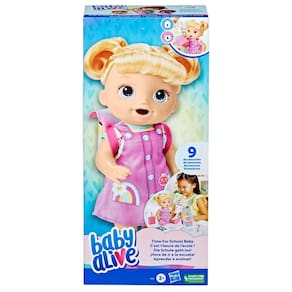 Conjunto de bonecas Baby Alive Time for School, 12 polegadas, brinquedos de volta às aulas para meninas e meninos, cabelos loiros, presentes pré-escolares para crianças de 3 anos ou mais (exclusivo da Amazon) — PREPARE-SE PARA O PRIMEIRO DIA: arrume sua mochila com tudo o que ela precisa para se divertir de volta às aulas. Dê a ela uma bebida e troque as fraldas também - ELA TEM AULA: finja a escola com estilo com roupas modernas de boneca, com um adorável suéter e sandálias (ambas removíveis) - ADESIVOS E PLANILHAS: acessórios para bonecas com tema escolar aumentam a diversão com 3 planilhas coloridas do tamanho de uma boneca que cabem na pasta e na mochila. Também podem ser decoradas com adesivos - BEBIDAS E MOLHOS: ela realmente bebe do acessório da caixa de suco e depois molha a fralda Baby Alive - BONECA DE 12 POLEGADAS: esta boneca Baby Alive com cabelo tem o tamanho certo para levar para qualquer lugar, com pernas e braços dobráveis. Ótimo presente para crianças — LET'S PLAY SCHOOL: conjuntos de bonecas e brinquedos pré-escolares, como Time for School Baby, são ótimos presentes de Natal, aniversário ou volta às aulas para meninas e meninos de 3 anos ou mais