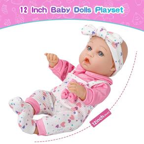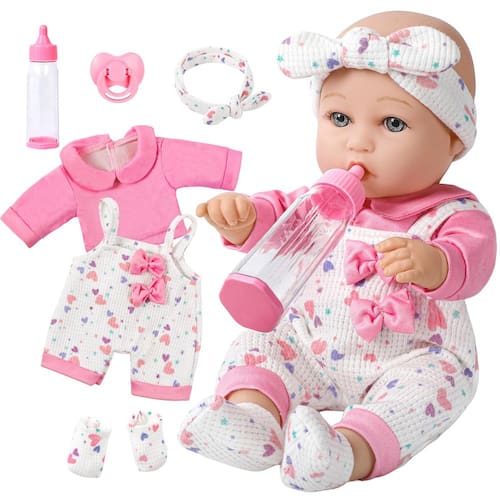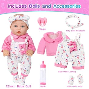 XFEYUE Conjunto de acessórios de roupas de boneca de bebê de 30 cm em caixa de presente com roupas rosa, chupeta e mamadeira ideia de presente para crianças a partir de 3 anos - Lista de pacotes: boneca de bebê de 30,5 cm, 1 conjunto de roupas de boneca, 1 mamadeira, 1 mamilo. - My First Doll Set, perfeito para os pequenos apresentarem o mundo do cuidado e companheirismo. Com 30 cm, é adoravelmente compacto e fácil para as crianças pegarem, abraçarem e carregarem. - Um bom amigo das crianças: esta linda boneca está cheia de sorrisos e seus cílios longos são muito fofos. Pode ajudar todas as crianças a criar um mundo cheio de diversão, imaginação e criatividade. É adequado para novos pais aprenderem alguns hábitos parentais e ajudarem as crianças a desenvolver autossuficiência. - Boa praticidade: bonecas e roupas laváveis deixam mães e crianças livres de desconforto. Se a boneca ficar suja, não se preocupe, basta limpá-la com um pano úmido. As roupas da boneca podem ser retiradas e limpas, o que é muito conveniente. - O presente perfeito: vem embalado pronto para uso ou para entregar como o presente perfeito para o Natal, feriados, aniversários ou qualquer outro momento. - Serviço de qualidade: Nós nos preocupamos com sua experiência de compra e oferecemos total satisfação. Se você tiver alguma dúvida ou sugestão, clique na página do seu pedido e clique em "Fazer uma pergunta" para entrar em contato conosco.