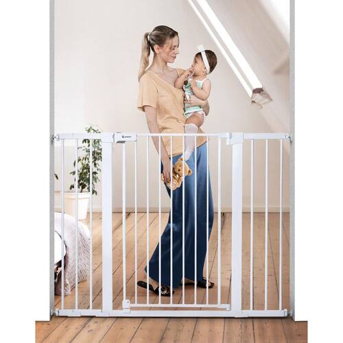 COMOMY Portão extra alto de 91,44 cm para portas de escadas, serve para aberturas de 75 cm a 124 cm de largura, fechamento automático extra largo para cães, montado com pressão, fácil de passar por portão de animais de estimação com porta, branco - 91 cm de altura x 124 cm de largura – mede 91 cm de altura. Nunca se preocupe com seus animais de estimação pulando sobre o portão. Cabe em aberturas entre 75 e 124 cm de largura. Este portão para animais de estimação é ideal para escadas, portas, corredores e casas. O portão grande de 59,9 cm facilita a caminhada. Aviso: meça suas aberturas antes de comprar para garantir o ajuste adequado - Segurança dupla - mais segurança com um sistema de bloqueio duplo, pressione o botão e levante-o para abrir - Porta de fechamento automático e fácil de instalar – o portão do animal de estimação será fechado automaticamente devido à gravidade. A porta pode ser girada em ambas as direções, fácil de operar o portão com uma mão. A instalação simples montada por pressão não requer ferramentas de perfuração, fácil de montar o portão alto para animais de estimação - Estrutura resistente – O portão para cães projetado em aço pode proteger contra impactos de até 45 kg por seus animais de estimação. Não se preocupe com o portão do cão ser empurrado para baixo e machucar seus filhos. Ótimo portão para cães para suas portas e escadas - Vencedora do prêmio Moms' Choice – Comomy, apoiada por anos de confiança, foi nomeada entre a qualidade em mídia, produtos e serviços para toda a família. Garanta sua paz de espírito e a segurança do seu filho com nosso portão de bebê premiado Moms' Choice Award