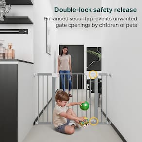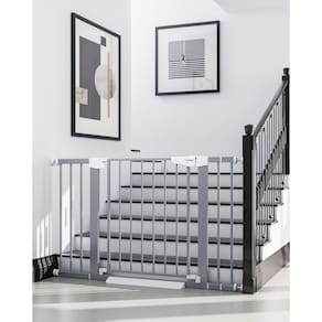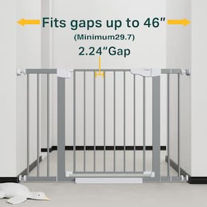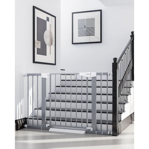 Cumbor Portão de bebê para escadas de 75 a 116 cm, vencedor do prêmio Mom's Choice - portão de cachorro com fechamento automático para casa, portões para animais de estimação montados com pressão - metal - Grande e largo: com 77,5 cm de altura e largura ajustável de 29,7 a 117 cm, este portão branco serve na maioria das portas! O design amplo facilita o transporte do seu bebê. Uma ótima opção para novos pais - Seguro para bebês – Mantenha seus curiosos rastreadores seguros com a liberação de segurança de trava dupla no topo das escadas. Projetado para ser difícil para as crianças abrirem, garantindo que seu pequeno fique seguro. - Design durável – Construído com aço, este portão para bebês pode suportar impactos de até 150N de cães como Huskies ou Alascas sem se mexer! Não precisa se preocupar com o portão sendo empurrado e machucando seus filhos, perfeito para casas com crianças e animais de estimação. - Fácil instalação: o sistema simples de montagem por pressão é fácil o suficiente para qualquer pessoa instalar em apenas 10 minutos. É perfeita para escadas, corredores, portas e espaços abertos. Certifique-se de que a distância de instalação entre as paredes superior e inferior esteja dentro de 29,7 a 117 cm. (Observação: funciona com paredes planas e rodapés) - Experiência de classe mundial: a Cumbor oferece portões para bebês de todos os tamanhos com acessórios correspondentes. Não precisa perder tempo ou dinheiro com extensões extras! Se você estiver procurando um tamanho diferente, basta rolar até a parte inferior da página para ver as opções. (Todos os portões suportam instalações de montagem por pressão e perfuração.)