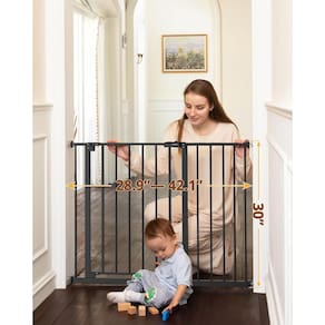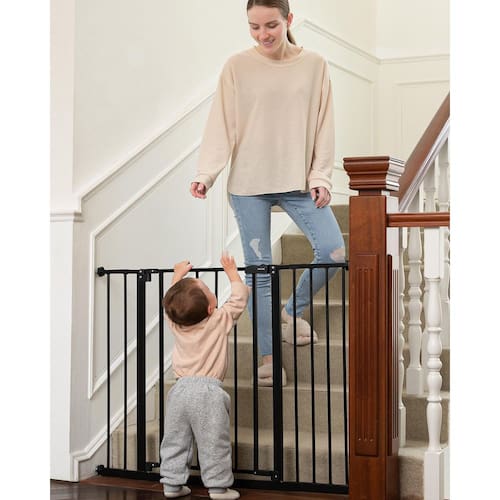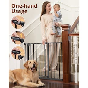 InnoTruth Portão de bebê de 73 a 106 cm de largura para escadas, portões de cachorro de 76 cm de altura para portas expansíveis com uma mão abertos, portões de metal com trava dupla para cães, - Largura ajustável e grande abertura: cabe na maioria das entradas e escadas entre 29 e 107 cm de largura, tem 76 cm de altura. A abertura (48 cm) é 25% mais larga do que os portões de metal comuns para bebês. É grande o suficiente para facilitar a caminhada enquanto segura o bebê. Ótima escolha para novos pais! - Operação com uma mão: quando a mão segura os bebês/roupas/alimentos, ainda é conveniente operar o portão com uma mão. A porta pode girar 180 graus e permanece aberta a 90 graus. Função de mãos livres e segura para a família - Design de bloqueio duplo – este modo de bloqueio dificulta a abertura do portão, portão de segurança resistente para manter seu bebê engatinhando fora do topo das escadas ou da cozinha e manter seus cães fora da área de estar principal. Perfeito para crianças de 6 a 36 meses. Ótimo para animais de estimação também - Fácil de instalar - podemos escolher pressão ou hardware montado para instalar o portão. A montagem por pressão não requer ferramentas, sem perfuração, deixa uma parede ou escadas intactas para você. E você pode removê-lo a qualquer momento quando não estiver em uso. (Certifique-se de que a porta tem entre 73 e 106 cm de largura) - Resistente e durável - Somos especializados na fabricação e venda de filhotes de bebê de alta qualidade, os compartimentos de 6 cm de largura garantem que o portão de segurança ofereça um invólucro seguro para seus filhos e cães, bem como instalações seguras para garantir um produto estável e seguro