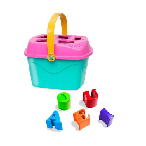 Vem com 5 letras (A-E-I-O-U) para o bebê encaixar, tem uma alça com formato ergonômico para o bebê levar.