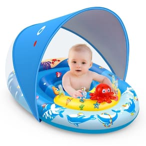 Bóia de piscina infantil EZIGO com dossel, proteção solar UPF50+, flutuador de piscina infantil inflável com brinquedos de animais marinhos para bebês de 6 a 36 meses, bóia de natação infantil com assento de segurança ajustável para meninos e meninas - Segurança máxima: a bóia de natação para bebês tem um assento de segurança ajustável na parte inferior para evitar escorregões. As câmaras de ar duplas e o design de alargamento lateral oferecem excelente flutuabilidade e estabilidade. A área reticulada entre as duas câmaras dos carros alegóricos para bebês oferece uma área de recreação segura - Toldo de proteção solar: o flutuador de piscina infantil é equipado com um toldo solar ajustável de 0 a 120 graus que fornece efeito protetor solar UPF 50+e protege o rosto do bebê da luz solar. As janelas laterais de malha oferecem perspectiva e ajudam os bebês a interagir com os pais enquanto nadam - Brinquedo atraente: um polvo que range, dois golfinhos com lantejoulas na barriga e dois sinos fofos. Seu bebê pode brincar com esses brinquedos de animais marinhos enquanto nada. Os belos padrões oceânicos no flutuador da piscina infantil fazem com que seu bebê se sinta como se estivesse no mundo subaquático - Material de segurança para bebês: este flutuador para piscina é feito de material de PVC de alta qualidade que atende aos padrões CPC, tornando-o 100% seguro e não tóxico. O assento com rede de ar feito de material supermacio é muito adequado para a pele do bebê. Recomendado para bebês de 6 a 36 meses - Feliz horário de verão: os flutuadores de piscina para bebês são ideais para brinquedos de piscina ao ar livre, praias, banheiras internas ou entretenimento aquático infantil. A bóia para bebês é dobrada e colocada em uma linda caixa colorida, que é fácil de inflar e esvaziar