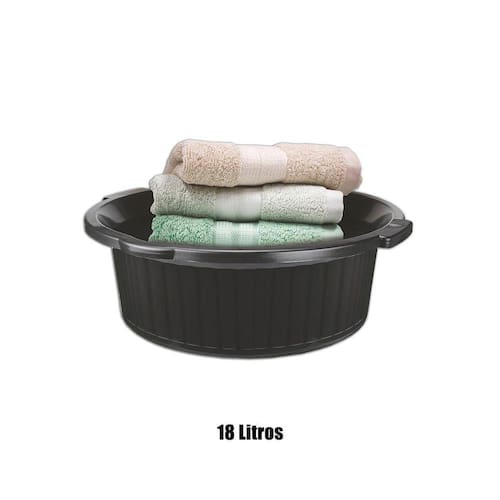 Bacia Preta de 18 litros, feita com plástico reciclado de alta resistência. É uma opção versátil para diversas atividades domésticas, tanto para a realização de limpezas quanto para transportar objetos.