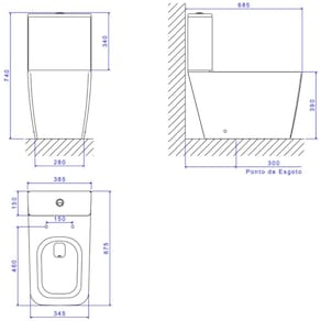 - Altura: 39,0 cm; - Largura: 38,5 cm; - Comprimento: 67,5 cm; - Medida do Sifão da Bacia: 50 mm.