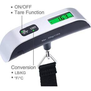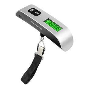 Balança portátil, display LCD digital de 110 lb/50 kg, mala eletrônica para pendurar bagagem, bolsa de viagem, ferramenta de equilíbrio de peso\ n\ nCaracterísticas: balanças de viagem com capacidade de 50 kg, indicador de sobrecarga e display LCD.\ nDesign elegante para viagens. É leve. Tem uma elegante plataforma de aço inoxidável. Tela LCD de fácil leitura. Design que se ajusta à sua mão com um toque confortável.\ nFácil de usar\ nIndicador de sobrecarga e bateria fraca. Sensor de medição de tensão de alta precisão\ nDescrição:\ nEsta balança é precisa e prática, ótima para pesar bagagem.\ nEspecificações:\ nCapacidade máxima: lb/50 kgGraduação: lb/10 gLuz de fundo: verde