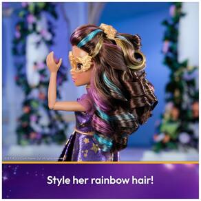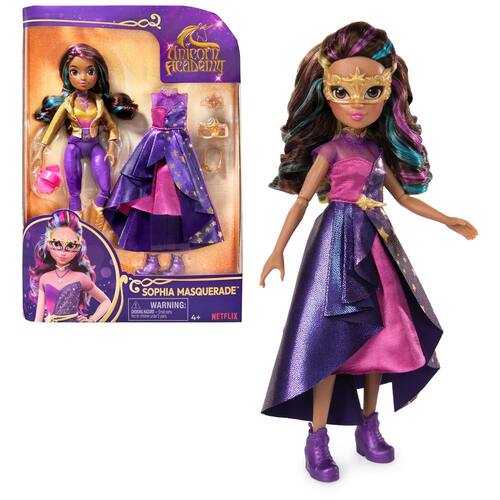Unicorn Academy, boneca Sophia Deluxe Masquerade Ball com 9 acessórios para bonecas e cabelo com listras de arco-íris, 9,5 polegadas, bonecas e brinquedos de unicórnio para meninas