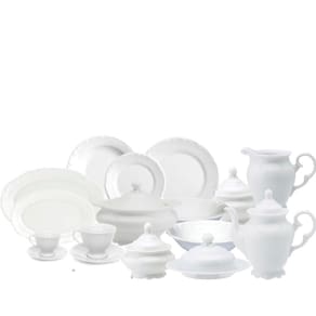 Baixela Serviço de Jantar Pomerode 52 peças :6 Pratos Rasos de 26 cms , 6 Pratos fundos de 23 cms, 6 Pratos de Sobremesa de 19 cms, e 6 Xicaras de Chá com 6 Pires e 6 Xicaras de Cafe com 6 Pires, 2 Saladeiras de 24cms de diametro e 2 Travessas 28x19 e 36x24 , 1 Soupeira de 3000ml ,01 Cafeteira 1,5litros, 01 Leiteira 1litro, 01 Mantegueira de 300ml e 02 Açucareiro de 300ml