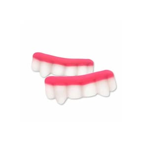 Bala de gelatina em formato de dentaduras. Colorida e aromatizada artificialmente. Pacote contém aproximadamente 200 unidades. Peso líquido total 1 kilogramas.