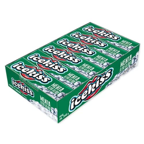 Caixa contendo 12 unidades de drops de bala Icekiss sabor Menta com 29 gramas cada. Peso líquido total 348 gramas.