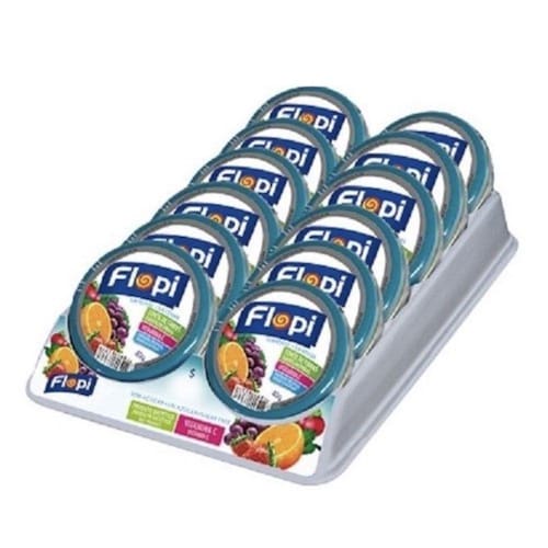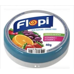 Caixa contendo 12 unidades de latinha com bala sem açúcar Flopi Mix sabor frutas com 40 gramas cada. Peso total da embalagem 480 gramas.