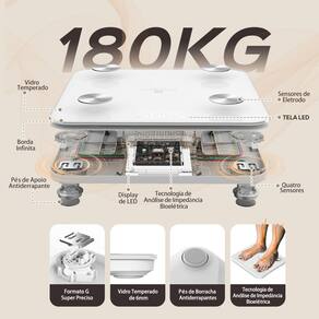 - Com capacidade de até 180 kg, plataforma de vidro temperado, tela digital em LED e memória para até 10 perfis de usuários, é perfeita para o uso no dia a dia, seja individual ou familiar.