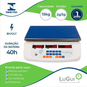 Capacidade máxima 15 kg, divisões de 2/5 gr; Displays LED 16 dígitos de 20 mm de altura e 7 mm de largura; Painel à prova de respingos, 16 teclas; Bandeja em aço inoxidável 330 x 210 mm; Pés reguláveis; Cobertura em plastico; Teclado flat do painel mostrador; Fonte externa: 110 a 240 VAC com chaveamento automático; OUTPUT: DC 6V 500mA; Autonomia da Bateria: 40h - Bateria recarregável; Indicador de bateria baixa LB - Low Bat ; Função TARA até 100% da capacidade máxima de pesagem; Função CONSTANTE para restaurante por quilo; Homologadas pelo INMETRO e aferidas pelo IPEM; Garantia: 06 seis meses Assistência Técnica em todo território nacional;
