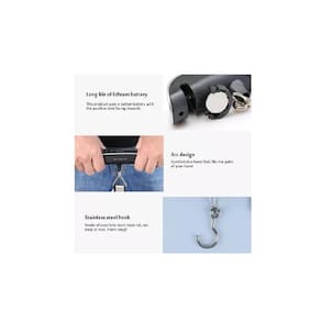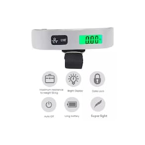 Descrição:Balança portátil de 110 lb/50 kg, display digital LCD, mala eletrônica para pendurar bagagem, bolsa de viagem, ferramenta de equilíbrio de peso\ nCaracterísticas: balanças de viagem com capacidade de 50 kg, indicador de sobrecarga e display LCD.\ nDesign elegante para viagens. É leve. Tem uma elegante plataforma de aço inoxidável. Tela LCD de fácil leitura. Design que se ajusta à sua mão com um toque confortável. Indicador de sobrecarga e bateria fraca fácil de usar. Sensor de medição de tensão de alta precisão\ nDescrição:\ nEsta balança é precisa e prática, ótima para pesar bagagem.\ nEspecificações:\ nCapacidade máxima: lb/50 kgGraduação: lb/10 gLuz de fundo: verde