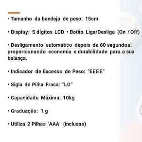 Balanca de cozinha digital alta precisao 10kg fitness Balanca digital de cozinha 10kg Balanca excelente para precisoes, podendo ser Utilizado em casa, acougues, lojas de conveniencia, hortifruti, supermercado etc. Especificacoes tecnica: Balanca digital portatil de alta precisao Medidas do produto: 22 x 15,3 x 3,3 cm Possui visor digital em lcd Realiza pesagem de 1g a 10kg Sistema de tara para descontar peso Fonte de alimentacao: 2 pilhas aaa nao inclusas Desliga automaticamente apos o uso Pesagem em gramas ou oz Cor: branco Marca: Não Informado