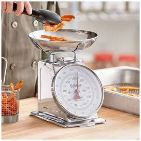 A balança de porcionar mecânica Galaxy SD-FLAT2B é um equipamento manual projetado para pesagem precisa de ingredientes em cozinhas comerciais, incluindo carnes, vegetais, farinhas e temperos. Possui tigela removível de aço inoxidável com diâmetro de 21,6 cm para facilitar pesagem e limpeza entre usos. Leitura dupla em escala imperial e métrica através de mostrador analógico protegido por capa plástica cromada.