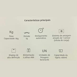 INFORMAÇÕES TÉCNICAS: Peso Capacidade: 5kg Divisão: 1g Desligamento Automático Sistema de pesagem através de 1 sensor célula de carga Display de alta definição Alimentação: 2 Pilhas AAA não acompanha as pilhas Unidade de Pesagem: KG/G;OZ;LB Capacidade da tigela: 600ml