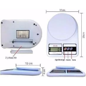 Dimensões: 25 x 19 x 4,5 cm. Cor: branca Dimensão do prato: 15 cm. Prato em plástico sem bordas Função tara auto calibração Escala em g e oz Visor lcd com desligamento automático ou manual Funciona com 2 pilhas aa Capacidade de peso de 1grama até 10 kilos com graduação de e em 1 grama. Peso: 500 gr .