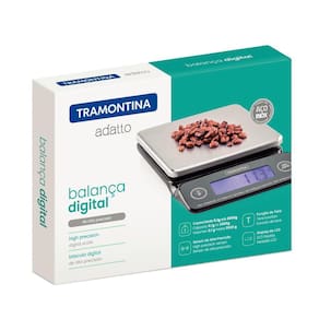 Balança Digital de Alta Precisão para Cozinha Tramontina Adatto com Base em Aço Inox A balança digital de alta precisão para cozinha Tramontina Adatto com base em aço inox é essencial para quem deseja garantir a medida certa de todos os ingredientes da sua receita. Com capacidade máxima para três kilos, ela tem base em aço inox de alta precisão e oferece dois sistemas de medida: métrico (g) e imperial (lb:oz). Para maior praticidade, ela possui indicação de pilhas fracas, sobrecarga, função de tara e ainda conta com desligamento automático. Uma balança com a qualidade Tramontina, que você já conhece e confia! Balança Digital Balança digital de alta precisão com base em aço inox. A balança de precisão oferece dois sistemas de medida: Métrico (g) e Imperial (lb:oz); Indicação de pilhas fracas e de sobrecarga; Com sensor extensômetro de alta precisão; Com função de tara; Desligamento automático. Capacidade máxima: 3 Kg 2 pilhas AAA de 1,5 V (não acompanham o produto)
