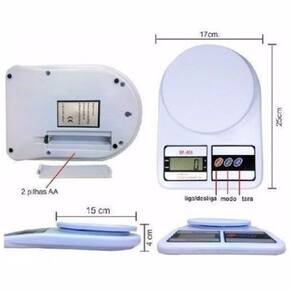 Dimensões: 25 x 19 x 4,5 cm. Cor: Branca Dimensão do prato: 15 cm. Prato em plástico sem bordas Função tara auto calibração Unidades: g, oz Capacidade: 10000g/354 oz Valor divisão: 1g Tamanho do LCD: 2 x 1 Visor LCD com desligamento automático ou manual Funciona com 2 pilhas AA Capacidade de peso de 1g até 10kg Peso: 500g