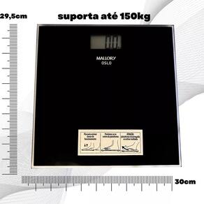 Produto: Balança Digital PessoalModelo: OsloMarca: MalloryCor: PretoCapacidade Máxima: 150 kgGraduação/Precisão: 100 g (0,1 kg)