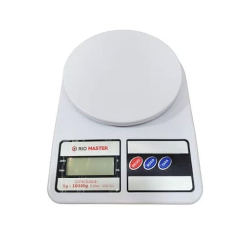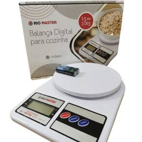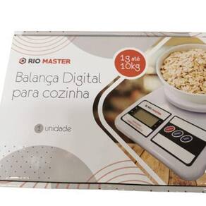 Balanca digital para cozinha 10kg - rio master Alimentação: 2 pilhas aa (inclusas) Tamanho aproximado da balança: 23,5x16,2x4,5cm Tamanho aproximado da caixa: a:19xl:25cm Peso aproximado: 350g Tipo de produto: balança digital para cozinha de 1g até 10 kg Cor: branca composição: plastico e componentes eletronicos