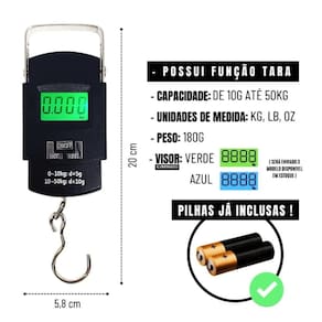 - balança digital portátil para o dia-a-dia com função tara, desligamento automático; - display de 4 dígitos com números grandes para melhor leitura; - botão: on/off; - unidades de medida: kg, lb, oz; - capacidade máxima de 50 quilos; - muito leve e prática; - possui gancho de alta qualidade, fabricado em aço, para pesagem; - possui modo de bloqueio lock e memorização do peso;