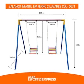 Balanço Infantil em Aço Galvanizado de 2 Lugares com Cadeiras Nosso Balanço Infantil é meticulosamente fabricado com tubos de aço galvanizado com pintura epóxi, oferecendo ótima resistência à ação do tempo, seja sol ou chuva.A pintura epóxi eletrostática supera as tintas comuns em durabilidade, mantendo a aparência vibrante e protegida contra desgastes. As cadeiras feitas de aço galvanizado e madeira de eucalipto, são finalizados com pintura sintética automotiva colorida, adicionando um toque de cor e alegria ao parquinho. As correntes que acompanham este balanço infantil, são feitos em aço galvanizado e zincado, os elos são pequenos para evitar acidentes. Características Técnicas e Informações de Uso:Material da Estrutura Metálica: Tubo de aço galvanizado com cano de 2,5" para estrutura robusta.Pintura da Estrutura Metálica: Epóxi eletrostática para maior resistência ao desgaste.Cadeiras: Feitas de aço galvanizado e madeira de eucalipto com pintura sintética automotiva.Material das Correntes: Elos pequenos em aço galvanizado e zincado.Medida da Corrente: 1,5m com um dos lados terminando em "V"Instalação: A estrutura da balança deve ser chumbada ao solo, para maior estabilidade e segurança.Idade Recomendada: Até 10 anos, garantindo diversão para diversas faixas etárias.Peso Máximo: 60 kg em cada assento, assegurando segurança durante o uso. Dimensões e Peso:Balanço: 2,05 x 1,60 e 1,93m de altura.Cadeira: 0,42 x 0,32m.Peso Total: 35Kg