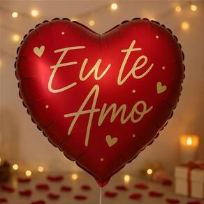 Cor: Vermelho vibrante. A tonalidade de vermelho é intensa e brilhante, característica do acabamento metalizado (foil). A superfície do balão reflete a luz, criando um efeito chamativo e luxuoso. O vermelho é a cor tradicionalmente associada ao amor, paixão, energia e celebração.