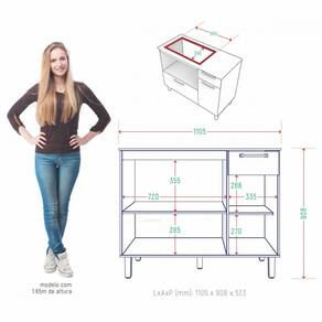 Altura: 90 cm Largura: 110 cm Profundidade: 52 cm 100 MDP de 15 mm Espa?o cooktop 66x39cm Tampo do balc?o j? vem cortado de f?brica Espa?o forno 72x35 cm Corredi?a met?lica Dobradi?a met?lica, sendo uma porta bascular com articulador Puxador de pl?stico P?s de pl?stico com regulagem Acabamento/Pintura Texturizado UV Verniz Fosco Suporte de peso 34 kg Garantia 03 meses